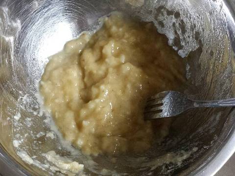 Rendam Biji Chia, Tepung Flaxseeds dalam 150ml air. Diamkan selama 30 menit. Ini juga bisa disiapkan semalam sebelumnya - Hancurkan pisang dengan garpu atau blender