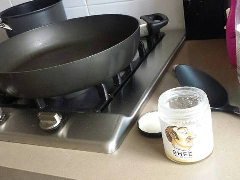 - Panaskan panci dengan api sedang. Oleskan sedikit minyak makan (saya pake Ghee - clarified butter - karena tahan panas tinggi)
